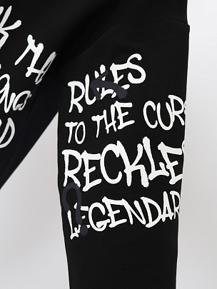 Джемпер с длинными рукавами, притачным поясом и манжетами. Манжеты и пояс выполнены из основного полотна. Горловина круглая с притачным воротником из полотна с добавлением лайкры. Перед и рукав декорированы принтом "Нарушай правила, будущее пренадлежит любознательным, юный и безбашенный, давай будем легендарными".
