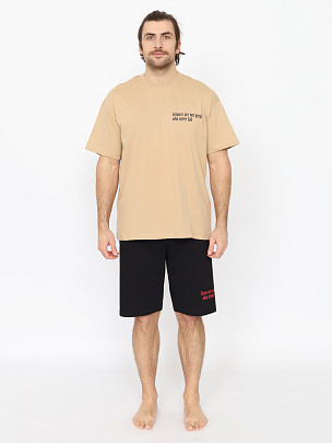Пижама гладкокрашенная из футболки и бридж. Футболка свободного покроя с коротким рукавом. Горловина обработана притачной бейкой из рибаны с лайкрой. Перед оформлен принтом. Бриджи прямые умеренного объёма длиной ниже колена выполнены из полотна дополнительного цвета. Цельнокроенный пояс обработан плоским швом вподгибку с одновременным прокладыванием резинки.