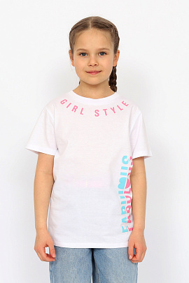 Футболка для девочки с трендовым колледж-принтом, с блестящим эффектом и контрастными бейками по горловине и рукавам. Модель сделана из 100%-хлопкового трикотажа. Материал приятно прилегает к телу, не сковывает движения и позволяет коже дышать.