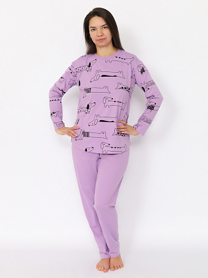 Комбинированная пижама из джемпера и брюк. Джемпер свободного покроя с длинным рукавом, набивной. Горловина обработана притачной бейкой из рибаны с лайкрой. Брюки прямые, умеренного объёма выполнены из гладкокрашеного полотна. Цельнокроенный пояс обработан плоским швом вподгибку с одновременным прокладыванием резинки.