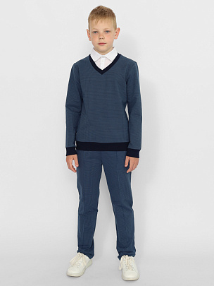 Джемпер с длинным втачным рукавом и манжетами. Манжеты, воротник и пояс выполнены из полотна с добавлением эластана. В горловине расположена эмитация рубашки с отложным воротником и стойкой.