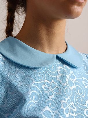 Джемпер для девочки с длинными рукавами и отложным воротником. Рукава из сетки с манжетами из кулирки. Полочка двойная - нижний слой из кулирки, верхний из сетки. Сзади застежка на пуговицу.