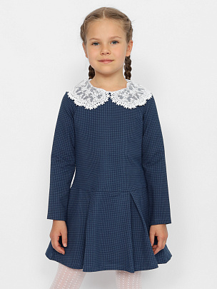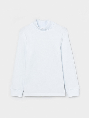 Джемпер для девочки с длинными рукавами и отложным воротником из кулирки, свободного силуэта. Рукава объемные, со спущенным плечом, снизу манжет из кулирки. Спинка с вырезом-капелькой и застёжкой на пуговицу-бусину с петлёй.