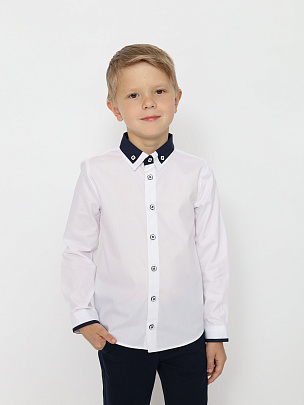 Джемпер для девочки с длинными рукавами и отложным воротником из кулирки, свободного силуэта. Рукава объемные, со спущенным плечом, снизу манжет из кулирки. Спинка с вырезом-капелькой и застёжкой на пуговицу-бусину с петлёй.