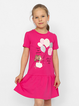 Платье для девочки отрезное по линии ниже талии. Юбка со сборкой по шву притачивания. Рукава короткие, со сборкой по окату. Горловина обработана узким воротником из полотна с эластаном. Перед платья декорирован принтом c объемной вышивкой "suzine" "Пусть летят твои мечты".