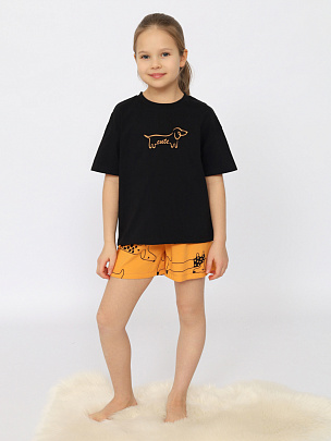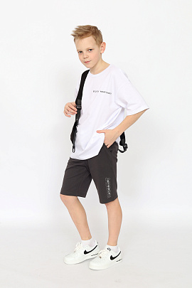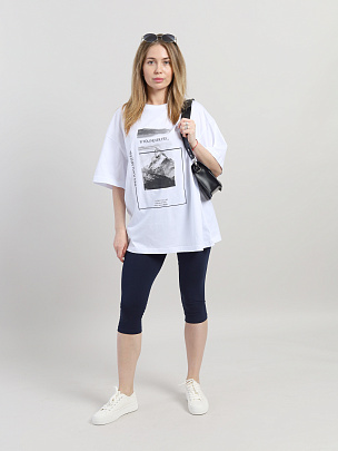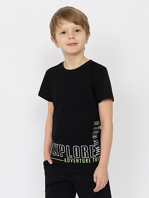 Футболка с коротким рукавом. Горловина круглая, обработана узким воротником из полотна с эластаном. Перед оформлен принтом.
