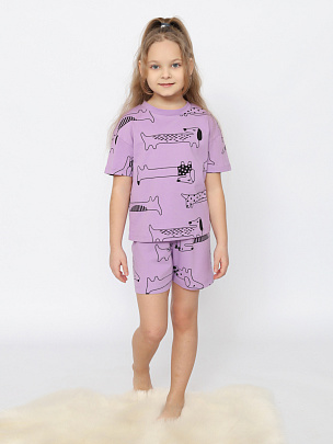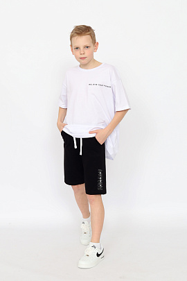 Футболка с коротким рукавом. Горловина круглая, обработана узким воротником из полотна с эластаном. Перед оформлен принтом с использованием краски с эффуктом "металлик".
