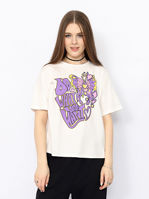 Футболка прямого силуэта с короткими рукавами. Горловина круглая, обработана притачной бейкой из рибаны с лайкрой. Перед футболки декорирован принтом с использованием глиттера.
